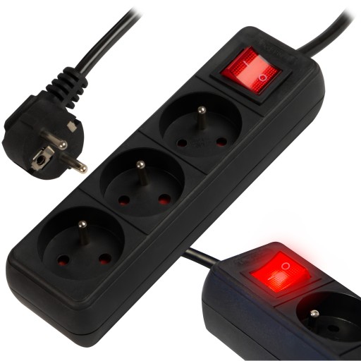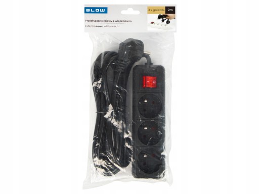 Przedłużacz sieciowy BLOW w kolorze czarnym z trzema gniazdami przeznaczony do użytku domowego. Przedłużacz pozwala podłączyć urządzenia, które są oddalone od gniazda elektrycznego. Produkt z jednej strony posiada 3 gniazda obrócone pod kątem oraz włącznik, a z drugiej pojedynczy kątowy wtyk sieciowy.