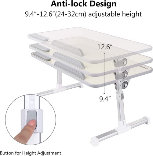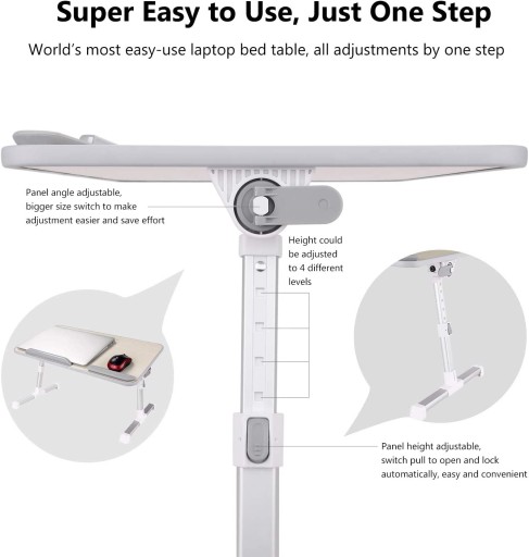 W pełni zmontowany z dwoma przyciskami z automatyczną blokadą z każdej strony dla łatwej i szybkiej regulacji wysokości, nogi można ustawić na 5 różnych wysokościach (regulowane od ok. 23,88 cm - 32 cm), plus dwa klipsy regulują kąt blatu , pulpit można ustawić pod 3 różnymi kątami (od 0 stopni do 30 stopni). Listwy na nadgarstki i ograniczniki na spodzie zapewniają bezpieczeństwo laptopa po przechyleniu, zapewniając wygodę i stabilność
