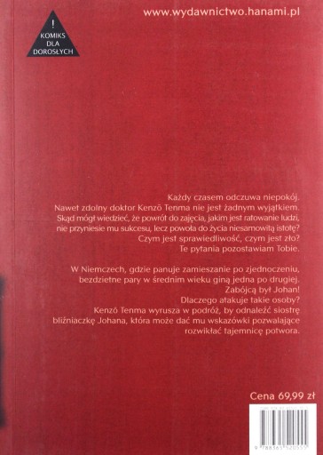 Każdy czasem odczuwa niepokój. Nawet zdolny doktor Kenz? Tenma nie jest żadnym wyjątkiem. Skąd mógł wiedzieć, że powrót do zajęcia, jakim jest ratowanie ludzi, nie przyniesie mu sukcesu, lecz powoła do życia niesamowitą istotę? Czym jest sprawiedliwość, czym jest zło? Te pytania pozostawiam Tobie. W Niemczech, gdzie panuje zamieszanie po zjednoczeniu, bezdzietne pary w średnim wieku giną jedna po drugiej. Zabójcą był Johan! Dlaczego atakuje takie osoby? Kenz? Tenma wyrusza w podróż, by odnaleźć siostrę bliźniaczkę Johana, która może dać mu wskazówki pozwalające rozwikłać tajemnicę potwora. Naoki Urasawa urodził się w 1960 w Tokio. Sławę przyniosła mu seria YAWARA! - opowieść o dziewczynie uprawiającej judo. Obecnie jest jednym z najbardziej rozpoznawalnych japońskich twórców komiksowych. Na Zachodzie znany głównie z ostatnich dzieł - MONSTER, 20th Century Boys i PLUTO. Otrzymał wiele nagród i nominacji, w tym jako jedyny twórca zdobył dwukrotnie Tezuka Osamu Sh?. Wśród swoich inspiracji wymienia prace Katsushiro ?tomo (autora Akiry).