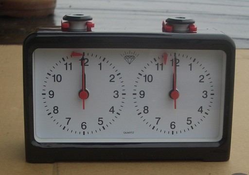 - zegar do rozgrywania partii tradycyjnych i błyskawicznych posiada tarczę godzinowa dwie wskazówki - godzinową i minutową oraz specjalną chorągiewkę precyzyjnie odliczającą ostatnie pięć minut gry