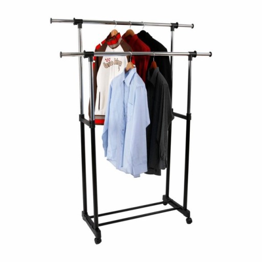 Oferujemy praktyczny i wytrzymały wieszak garderobiany na kółkach. Wieszak sprawdzi się w każdym domu i w biurze, w którym brakuje miejsca do powieszenia odzieży. Nasz produkt został wyposażony w podwójny chromowany drążek z wyjątkowo grubych rurek. Dodatkowym atutem wieszaka jest wytrzymała i zaskakująco pojemna półka na buty, oraz nakładki na końce drążka uniemożliwiające zsunięcie się odzieży. Montaż wieszaka jest niezwykle prosty i nie wymaga użycia narzędzi. Posiada regulację wysokości i szerokości.