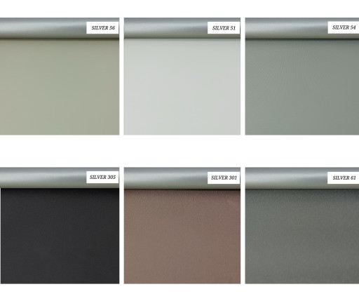 Dostępne modele tkanin zaprezentowano na zdjęciu. Na każdym próbniku pokazano także zewnętrzną powłokę silver.