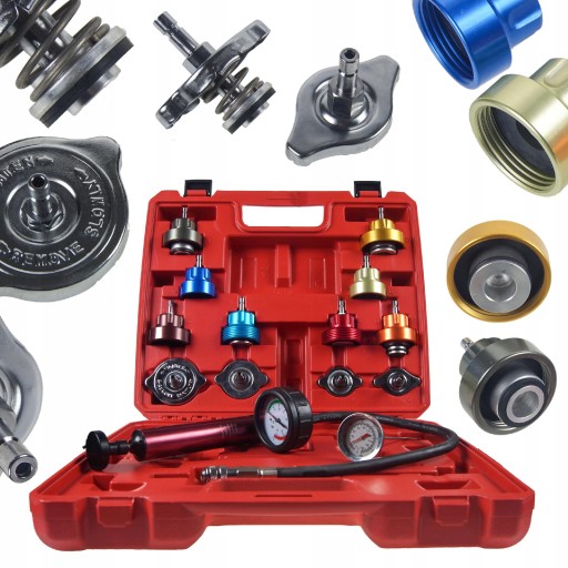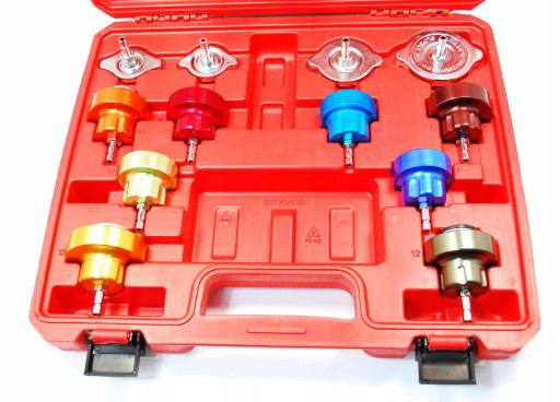 Profesjonalny tester szczelności układu chłodniczego i nagrzewnicy.Znajduje zastosowanie w pracach przy samochodach osobowych, dostawczych i ciężarowych. Dodatkowo w zestawie znajduje się termometr z długą nogą, którą wsadzamy do chłodnicy. Pozwala to sprawdzić sprawność działania termostatu. Zestaw wyposażony jest w 12 zakrętek do różnego rodzaju chłodnic, które mocujemy z pompką za pomocą systemu szybkozłączek.