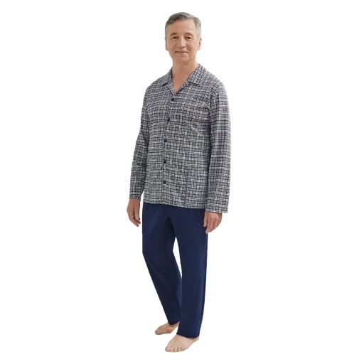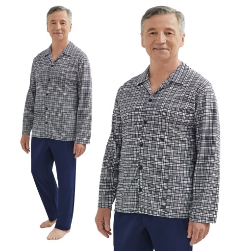 Elegancka dwuczęściowa piżama z 100% czystej bawełny. Koszulowa góra piżamy jest całkowicie rozpinana, z kieszeniami. Elegancji nadaje jej kołnierzyk i wzór w kratkę. W komplecie znajdują się luźne, gładkie, długie spodnie. Bardzo elegancka i wygodna piżama męska na długi rękaw.
