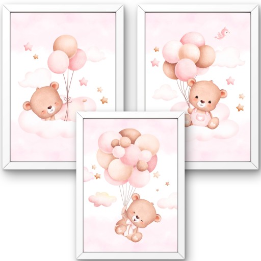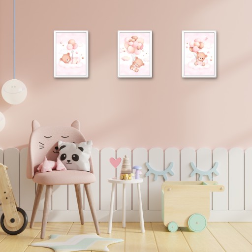 - Zestaw plakatów "Pluszowe misie z balonami" to świetny pomysł na aranżację pokoju dziecięcego.