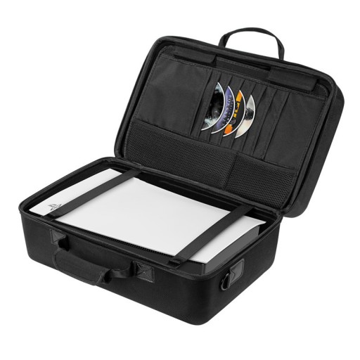 - Niezwykle pojemna — pomieści 2 pady, słuchawki, stację ładującą na 2 pady, 8 płyt z grami i przewody.