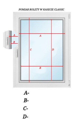 PRZYKŁAD: A= 68,5 cm, B=66,5 C=121,5 cm D=119,5 cm, materiał LUX 3005, kaseta biała, strona łańcuszka prawa, listwy przyszybowe płaskie