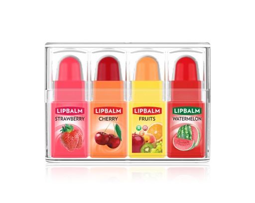 W skład zestawu wchodzi balsam w wersji: truskawka, wiśnia, owocowy, arbuz.