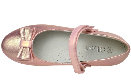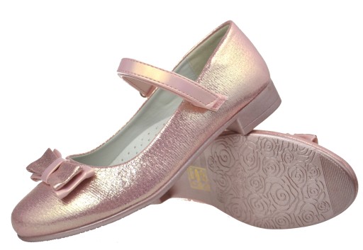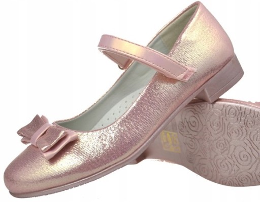 Śliczne pantofelki dziewczęce wykonane ze skóry ekologicznej z wyprofilowana skórzaną wkładka. W ślicznym kolorze z lekkim mieniącym się efektem. Wyglądają ślicznie na żywo. Buciki zapinane na rzepy. Zdobione elegancką mieniącą się kokardką