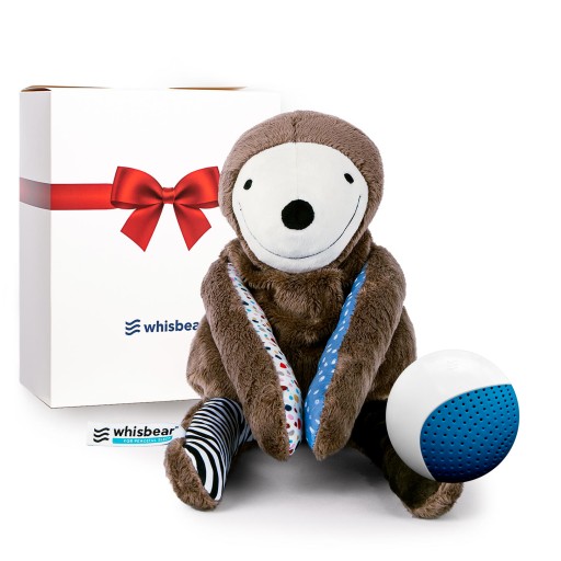We wnętrzu szumiącej zabawki Whisbear umieściliśmy inteligentne urządzenie zarządzane przez aplikacje z funkcją CRYsensor, które reaguje szumem na płacz dziecka oraz emituje trzy rodzaje szumu: różowy, biały lub szum fal morskich. Daje także możliwość dostosowania do potrzeb Maluszka długości i głośności szumienia.