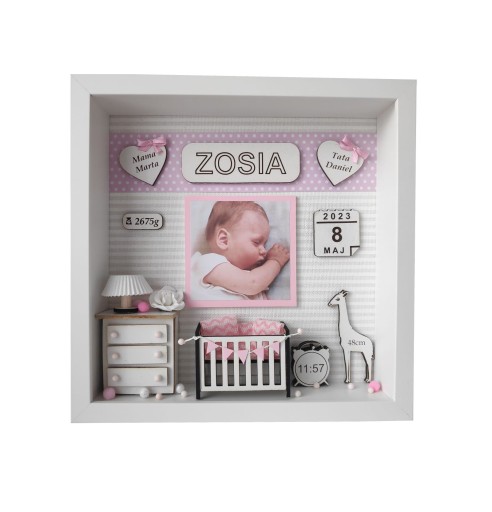 Ręcznie wykonana metryczka ze zdjęciem, w formie ramki 3D w rozmiarze 27×27 cm dla dziewczynki.
