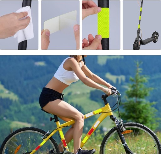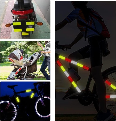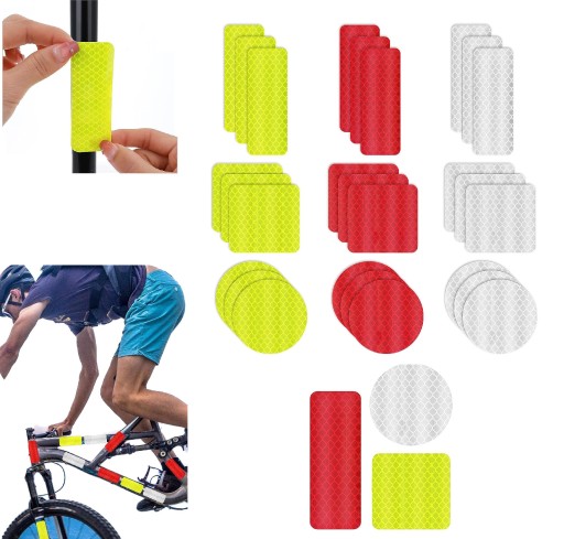 Taśmy naklejek są odblaskowe, co sprawia, że świetnie odbijają światło, zwiększając widoczność rowerzysty w ciemności.