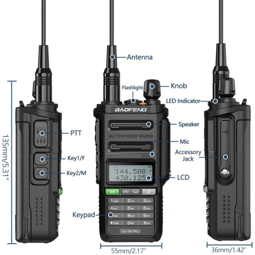 Baofeng UV-9R Pro to dwupasmowy radiotelefon (duobander) z podwójnym wyświetlaczem, klawiaturą DTMF i funkcją Dual Watch.