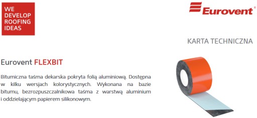 Taśma bitumiczna Eurovent® FLEXBIT, aluminiowa taśma reperacyjna na podłożu bitumicznym, służąca do sklejania i uszczelniania obróbek dekarskich w obszarach dachów płaskich i skośnych. Dostępna w kilku wersjach kolorystycznych. Wykonana na bazie bitumu, bezrozpuszczalnikowa taśma z warstwą aluminium i oddzielającym papierem silikonowym.