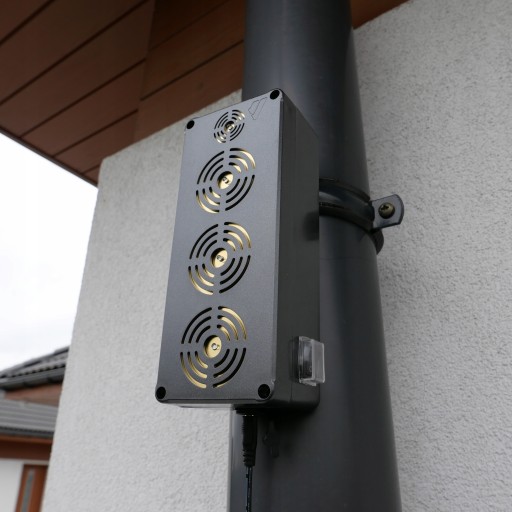 W urządzeniu zainstalowano aż cztery głośniki piezoelektryczne – trzy średnicy 50mm i jeden 35mm oraz cztery diody wysokiej jasności. Całość uzupełnia hermetyczna obudowa w klasie szczelności IP65 co umożliwia wykorzystywanie odstraszacza zarówno w pomieszczeniach, jak i na zewnątrz. Polskie urządzenie skonstruowane zostało do warunków klimatycznych panujących w naszym kraju – jest odporne na promienie słoneczne, deszcz, mróz i wiatr.
