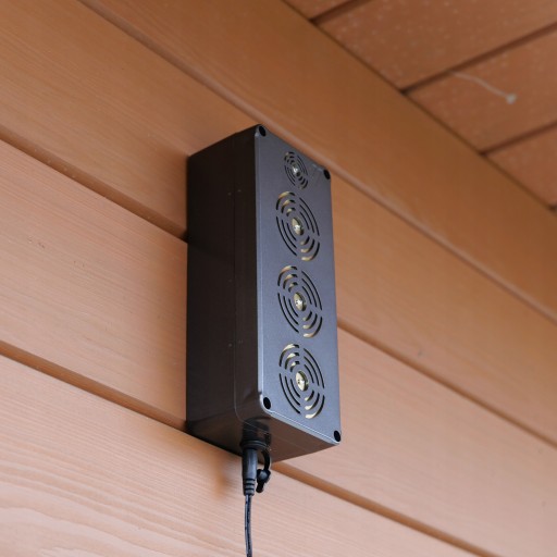 - Cztery diody błyskowe wysokiej jasności - wyzwalają serię mocnych błysków. Szkodnik widząc błyski, zniechęca się do wejścia w chroniony obszar. Diody można wyłączyć przyciskiem zainstalowanym z boku urządzenia, pozostając wyłącznie przy ochronie za pośrednictwem emisji ultradźwięków.