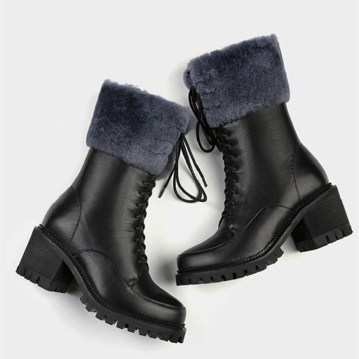 Buty damskie zimowe marki LISIKUK zostały wykonane ze śliskiego skóra ekologiczna o właściwościach wodoodpornych. Wnętrze jest ocieplone grubym wełna, które zapewnia ciepło i dodatkowo podwyższa komfort chodzenia. Zapięcie na suwak pozwala na szybkie i wygodne zakładanie. Gruba podeszwa zapewnia świetną izolację od podłoża i ma właściwości antypoślizgowe. Wysokie śniegowce LISIKUK w kolorze czarnym zdobią przeszycia na cholewce oraz wystające na zewnątrz futerko.