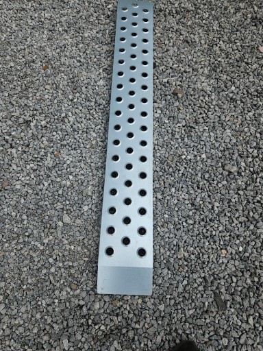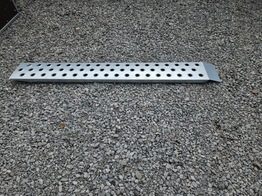 Najazdy o długości 150cm, szerokości 21 cm oraz wysokości 3,5 cm zakończone są 10 cm wypustką. Dzięki wykonanym gięciom ( w tym przypadku ten najazd posiada dodatkowo jedno wzdłużne gięcie z każdej ze stron) oraz wzmocnieniom wytrzymałość jednego najazdu wynosi około 200 kg
