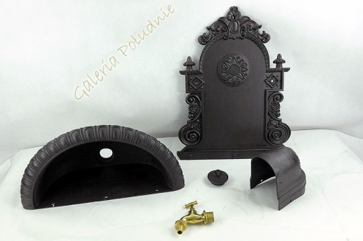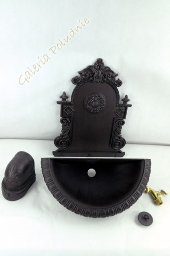Aluminiowy wiszący zlew ogrodowy z kranem zdobiony ornamentem roślinnym.