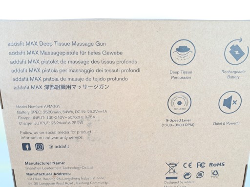 Pistolet do masażu addsfit Max posiada dziewięć stopni prędkości: 1700, 1900, 2100, 2300, 2500, 2700, 2900, 3100 i 3300 uderzeń na minutę. Ma ona około 12 mm głębokości i zapewnia siłę około 35 funtów dla optymalnego masażu tkanek głębokich.
