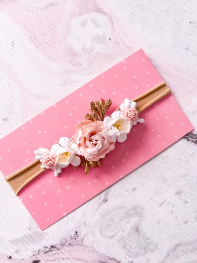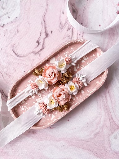 Ręcznie wykonany zestaw opaska oraz pasek ozdobiona delikatnymi kwiatami w waniliowymi i różowym. Idealny dodatek do stylizacji na Chrzest, roczek czy do sesji zdjęciowej.