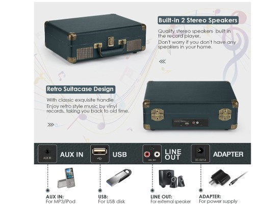 - Trzy prędkości – możliwość regulacji odtwarzania płyt gramofonowych o prędkości 33, 45 lub 78 obr./min – nadaje się do większości płyt winylowych