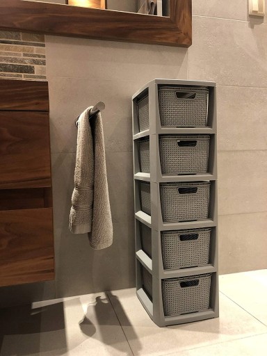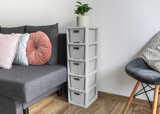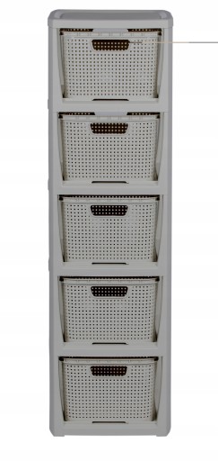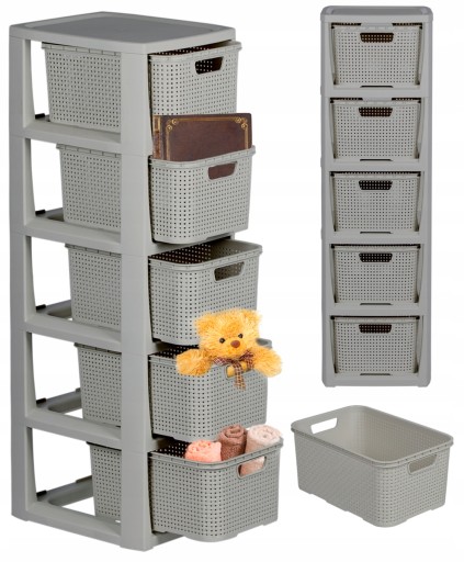 Produkt składa się z 5 pojemników, które pełnią funkcję szuflad. Zostały wykonane z tworzywa sztucznego, ale swoim wyglądem przypominają rattanowe kosze. Dzięki temu prezentują się bardzo estetycznie.