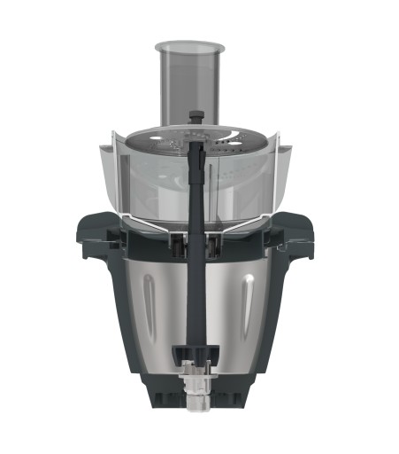 Krajalnica WunderSlicer jest umieszczona na pokrywie naczynia miksującego i używa ostrza mieszającego do napędzania tarczy tnącej.