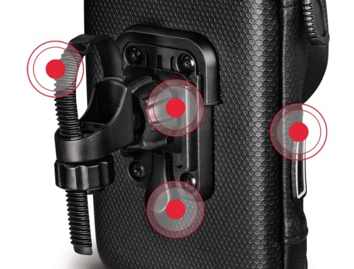 Futerał przeznaczony jest do zamocowania na kierownicy roweru za pomocą specjalnej obejmy. Maksymalna średnica rury kierownicy to 40 mm.
