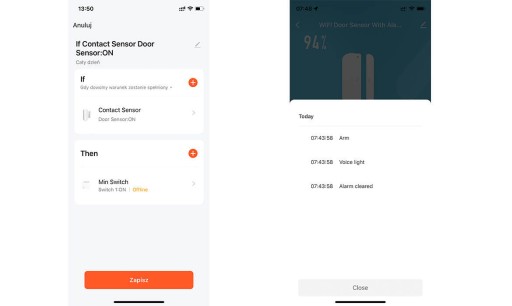 - Możliwość tworzenia scen z innymi urządzeniami np. Włącz światło lub kamerę gdy drzwi zostaną otwarte.