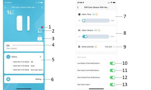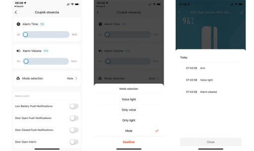 - Łatwa konfiguracja powiadomień: o alarmie, o otwarciu, o zamknięciu, o słabej baterii
