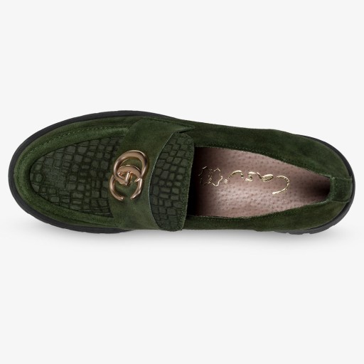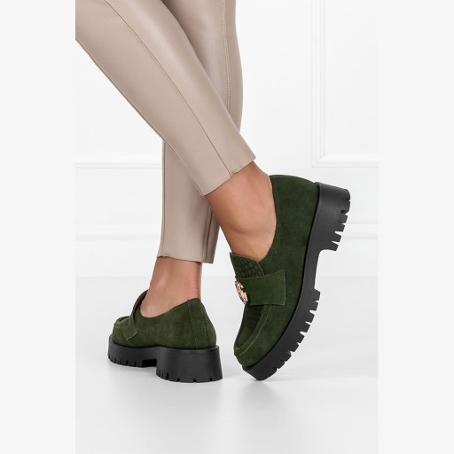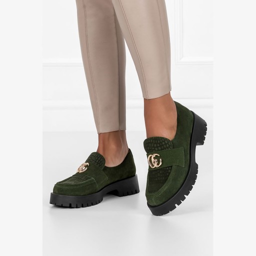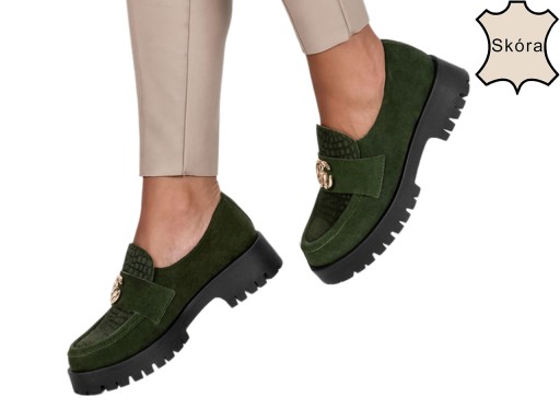 Zielone mokasyny skórzane damskie model 20153 zostały wyprodukowane w Polsce z najlepszych gatunków skór. Ręczne wykonanie butów gwarantuje doskonałą jakość, wygodę i dopasowanie do stopy. Wnętrze obuwia zostało wytworzone z wysokiej jakości skóry, która zapewnia maksymalny komfort użytkowania. Zielone mokasyny to niezwykle stylowe obuwie, które idealnie łączy elegancję z casualowym wyglądem. Piękny odcień zieleni nadaje im uroku, dzięki czemu świetnie pasują zarówno do codziennych, jak i bardziej formalnych stylizacji. Złota ozdoba umieszczona na cholewce dodaje tym mokasynom luksusowego akcentu, przyciągając wzrok i nadając im unikalnego charakteru. To efektowny detal, który podkreśla ich elegancki wygląd. Podeszwa z rowkami to praktyczne rozwiązanie, które gwarantuje doskonałą przyczepność na różnych powierzchniach. Nie tylko sprawia, że mokasyny są stabilne i wygodne w chodzeniu, ale również dodaje im pewnej sportowej dynamiki, co jest świetnym połączeniem z ich klasycznym designem. Są doskonałym wyborem dla osób, które cenią sobie wyjątkowy styl, komfort i jakość wykonania. Sprawdzą się zarówno na co dzień, uzupełniając casualowe outfity, jak i na bardziej oficjalne okazje, gdzie dodadzą uroku i szyku do każdej stylizacji. Wybierz swojego faworyta na Casu