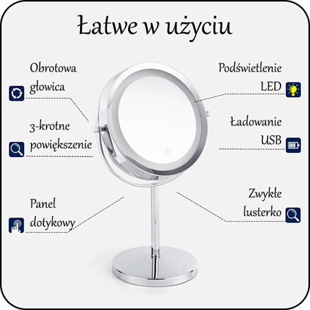 Lusterko jest bardzo łatwe w użyciu oraz posiada dotykowe ekran dzięki czemu będzie się nadawać idealnie dla osób w każdym wieku.