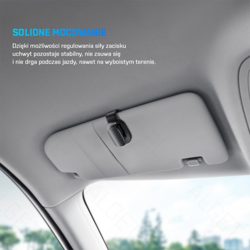 Uchwyt z klipsem jest mocowany stabilnie na przesłonie słonecznej. Dzięki możliwości regulowania siły zacisku pozostaje stabilny, nie zsuwa się i nie drga podczas jazdy, nawet na wyboistym terenie.