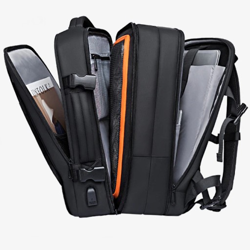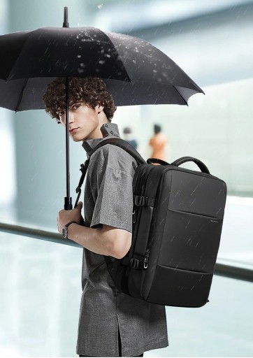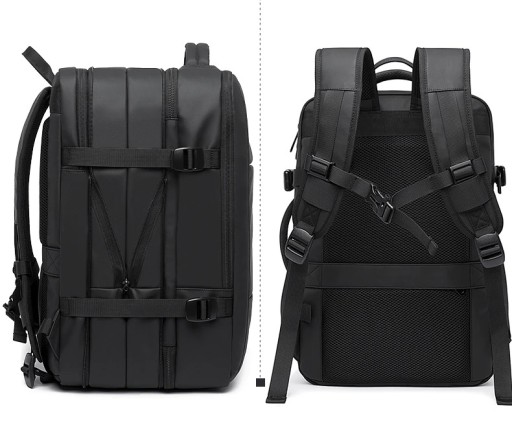 Trzykomorowy plecak marki Bange BG-1908 wykonany jest z wytrzymałego i wodoodpornego materiału oxford. Wyróżnia się bardzo funkcjonalną konstrukcją – dzięki możliwości otwierania środkowej komory na płasko jak walizkę, zapakowanie rzeczy do plecaka jest zdecydowanie wygodniejsze. Dodatkowym atutem plecaka jest możliwość szybkiego powiększenia go o 12cm poprzez rozpięcie biegnącego po całym obwodzie zamka. W komorze z tyłu plecaka znajduje się miękka kieszeń na laptopw rozmiarze do 17,3" zabezpieczona taśmą zapinaną na rzep oraz mniejsza kieszeń na tablet. Obszerna komora główna posiada przestrzeń na zapakowanie ubrań zapinaną siatkową przegrodą oraz wodoodporną kieszeń na kosmetyki. Przednia komora przeznaczona jest na zapakowanie drobiazgów i akcesoriów. Znajduje się tutaj kilka kieszonek, organizer na długopisy, przypinka do kluczy oraz złącze USB, dzięki któremu nie ma konieczności wyciągania power banka z plecaka, aby naładować telefon lub inne przenośne urządzenie. Z przodu umieszczono dodatkowe dwie małe kieszonki na podręczne rzeczy oraz jedną większą, schowaną pod rantem materiału. Główna komora plecaka zabezpieczona jest przed niekontrolowanym rozpięciem za pomocą dodatkowych pasków z mocnym zapięciami, umieszczonych po bokach plecaka. Szelki plecaka, podobnie jak plecy, są wyłożone sprężystymi gąbkami zwiększającymi komfort w trakcie noszenia. Na szelkach umieszczono dodatkowy pas piersiowy, aby lepiej rozłożyć ciężar plecaka przy dużym obciążeniu. Na plecach znajduje się również dyskretna kieszonka zapinana na zamek, w której można bezpiecznie przechować telefon lub portfel. Nad szelkami znajduje się solidny uchwyt służący do przenoszenia plecaka w ręce, natomiast drugi uchwyt umieszczono z boku i przydaje się przy używaniu plecaka jako walizki. Model BG-1908 polecamy osobom poszukującym plecaka z opcją powiększenia go i wykorzystania jako pojemnego bagażu.