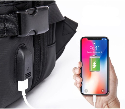 Plecak wyposażony jest w gniazdo USB, dzięki czemu nie ma konieczności wyciągania power banka z plecaka, aby naładować telefon. Uwaga, power bank nie jest częścią zestawu.