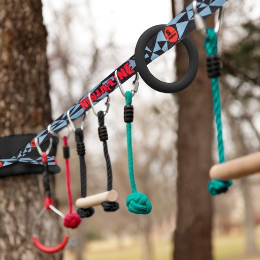Popularna SLACKERS Ninja Line w nowym designie i z nowymi przeszkodami! Pas Ninja o długości 11 m (długość użytkowa ok. 9 m), szerokość 5 cm, z wszytymi pętlami do mocowania przeszkód i uchwytów wspinaczkowych. Zestaw zawiera również solidną metalową grzechotkę z plastikową rączką i wszytą pętlą, a wszystko to w wytrzymałej torbie transportowej. W linię wszytych jest 14 pętli do mocowania poręczy i przeszkód za pomocą bezpiecznych metalowych karabinków delta. Zestaw zawiera łącznie 2 kółka gimnastyczne, 2 małpie huśtawki, 2 małpie pięści i 1 kółko trapezowe. Podstawowy pasek/lina Ninja może być również używana jako klasyczny slackline. Całość zapakowana w pudełko zawierające praktyczną torbę, opis i instrukcję.