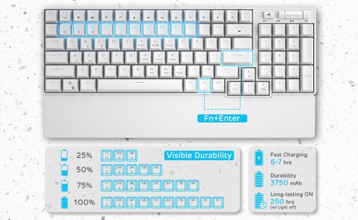 BT5.0/2.4G/USB-C – Wierz lub nie, jest to pierwsza generacja bezprzewodowych klawiatur z trzema trybami na rynku. Tryb bezprzewodowy ze stabilnym Bluetooth 5.0, bezproblemowy klucz sprzętowy 2,4 GHz i przewodowy tryb USB-C nie wyznaczają granic połączenia z klawiaturą.
