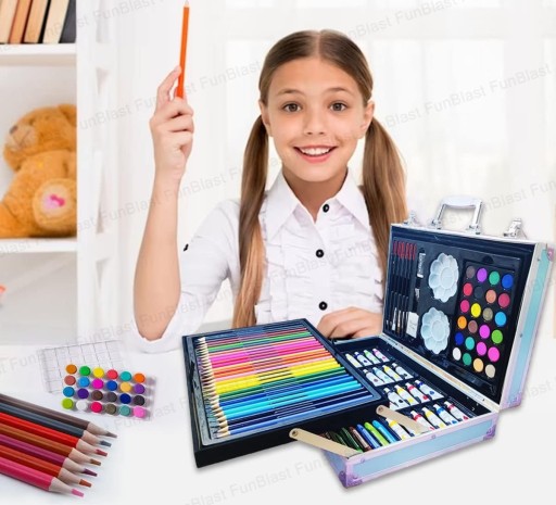 Kupujesz kompletny zestaw artystyczny wspaniałe rozwiązanie dla młodych artystów, którzy chcą rozwijać swoje umiejętności malarskie. Zestaw składa się aż z 145 elementów, w tym farby akwarelowe i olejne, pędzle różnych rozmiarów, kredki węglowe, gumki, mazaki i wiele innych.