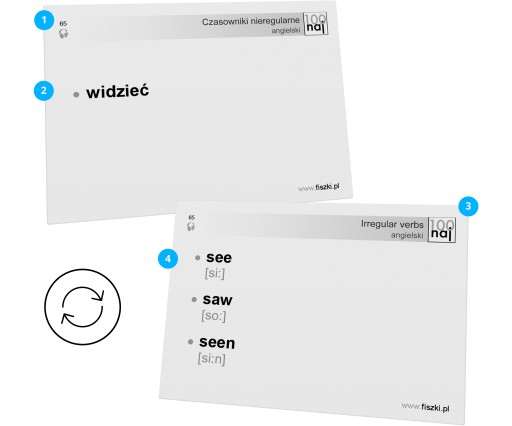 Przedstawiamy fiszki do nauki języka angielskiego. Opakowanie zawiera trzy podstawowe formy 100 czasowników nieregularnych z transkrypcją fonetyczną (Infinitive, Past Simple i Past Participle).