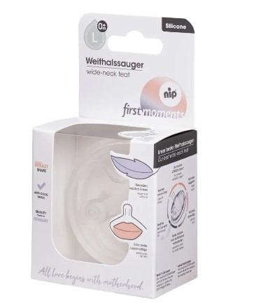 Smoczek first moments z szeroką szyjką jest dostępny w rozmiarze M - Średni rozmiar otworu ssącego dla średniego przepływu napoju. Nadaje się do żywności mlecznej w proszku.