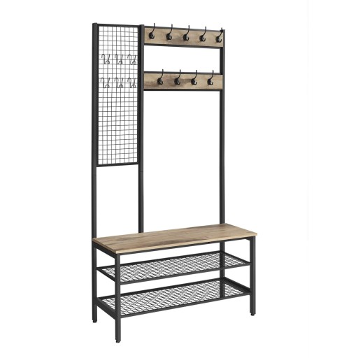 Łączy funkcjonalność wieszaka ubraniowego, szafki na buty i półki do przechowywania.