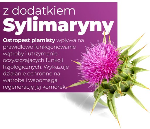 Innym składnikiem produktu jest naturalny ekstrakt z sylimaryny, będący substancją pochodzenia roślinnego. Środek ten wykorzystywany jest w medycynie i farmacji ze względu na swój korzystny wpływ na funkcjonowanie i zdrowie wątroby. Ekstrakt działa przeciwzapalnie, antyoksydacyjnie i detoksykująco. Ponadto bierze on także udział w procesie wytwarzania żółci, a tym samym wspomaga proces trawienia. Substancja ta zapobiega także marskości wątroby i skutecznie chroni ją przed działaniem niepożądanych środków, toksyn, a nawet trucizn.