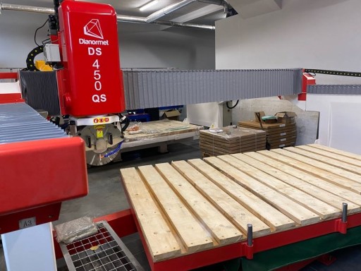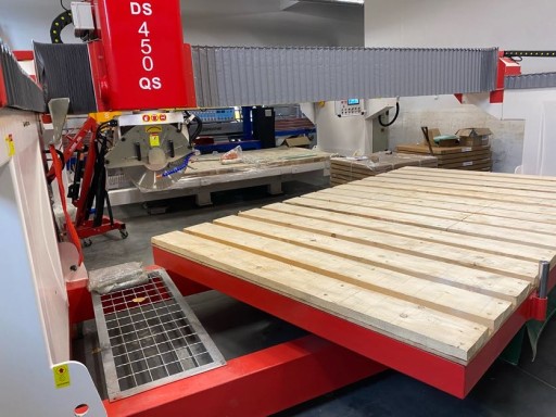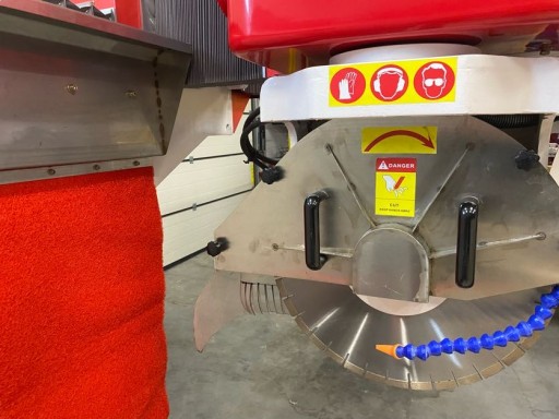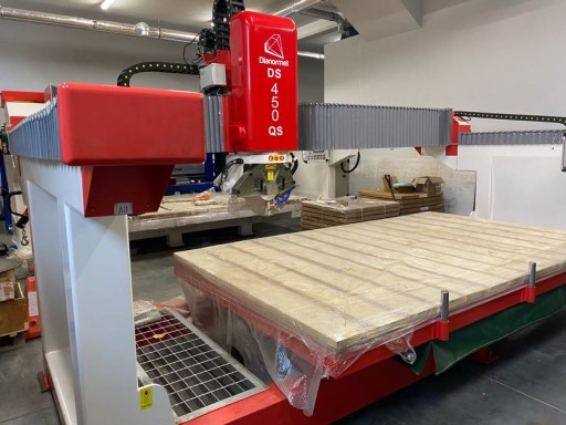 Cyrkularka do kamienia z możliwością cięcia prostego oraz pod kątem 45°. Maszyna z uchyłem stołu roboczego do 85°, z obrotem stołu roboczego co 1°. Maszyna monoblokowa – brak dodatkowych kosztów typu wylewanie fundamentów pod stół, możliwość przeniesienia maszyny w dowolnym momencie w inne miejsce. Głowica uchylna 0° – 45° i z obrotem 0° – 90° – 180°- 270°. Maszyna ze względu na swoją wagę (~6t) jest bardzo solidna i stabilna.