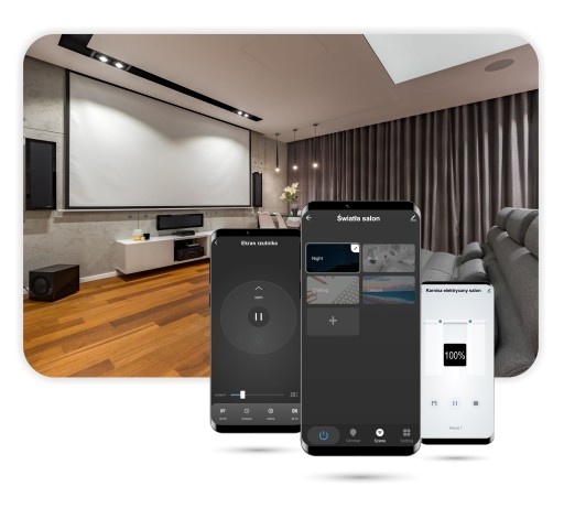 Magnetyczne Systemy szynowe SMART TRACK pozwalają również na tworzenie różnego rodzaju integracji z innymi elementami automatyki domowej. Na przykład przed wieczornym seansem filmowym jednym kliknięciem zamkniemy zasłony , zgasimy światło, a projektor włączy się i będzie czekał na wybranie przez Ciebie filmu.