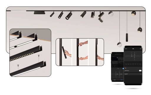 Reflektory w magnetycznych systemach szynowych SMART TRACK są w pełni konfigurowalne. W zależności od potrzeb można ustawić harmonogram, o której godzinie mają się włączyć i z jaką intensywnością i barwą światła mają świecić. Można nimi sterować również za pomocą czujników zewnętrznych, jak na przykład czujnik ruchu lub czujnika otwarcia/zamknięcia drzwi.