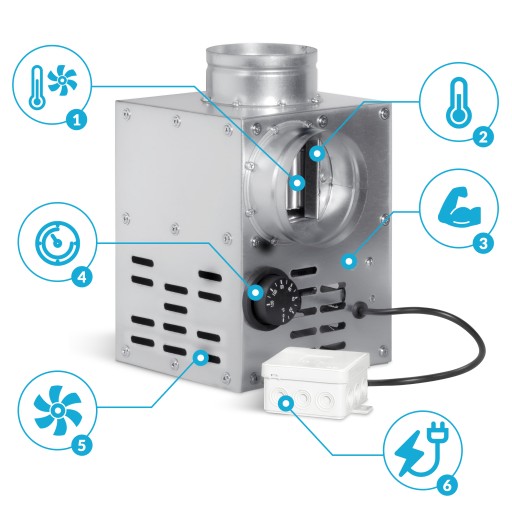 ⏩ Posiada odizolowany termicznie i akustycznie wentylator nadmuchujący powietrze oraz termostat. Zapewnia to automatyczną i cichą pracę wentylatora nadmuchowego.
