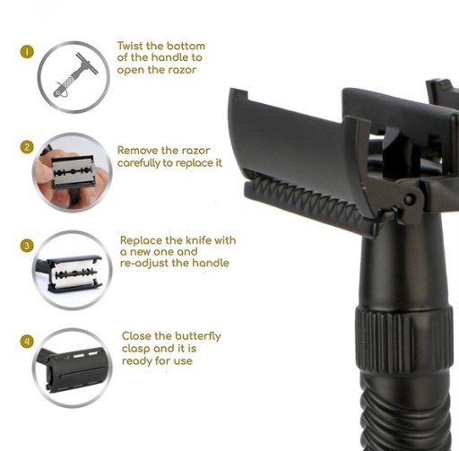 - wymiana żyletki poprzez otwieranie skrzydełek ( pokrętło na końcu rączki )