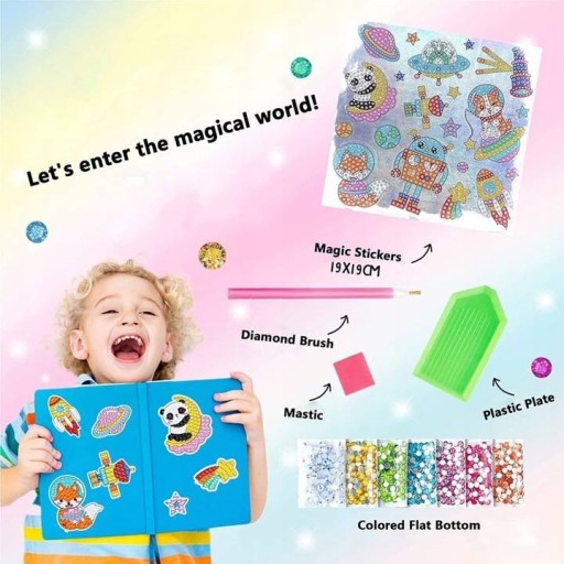 Zestaw zawiera naklejki w różnych kształtach, które można ozdabiać małymi, połyskującymi kamieniami diamentowymi.