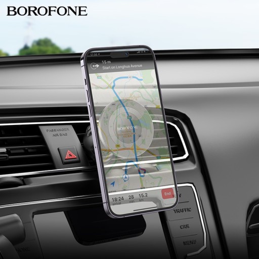 BOROFONE BH90 Ring to zwiększający bezpieczeństwo jazdy, magnetyczny uchwyt do telefonu / na telefon, montowany do kratki wentylacyjnej pojazdu / na kratkę wentylacyjną pojazdu za pomocą zacisku z regulowaną siłą docisku, wyposażony w przegub kulowy dający możliwość montażu urządzenia pod kątem 90 stopni z rotacją 360 stopni dla jeszcze lepszej możliwości dostosowania do potrzeb kierowcy.